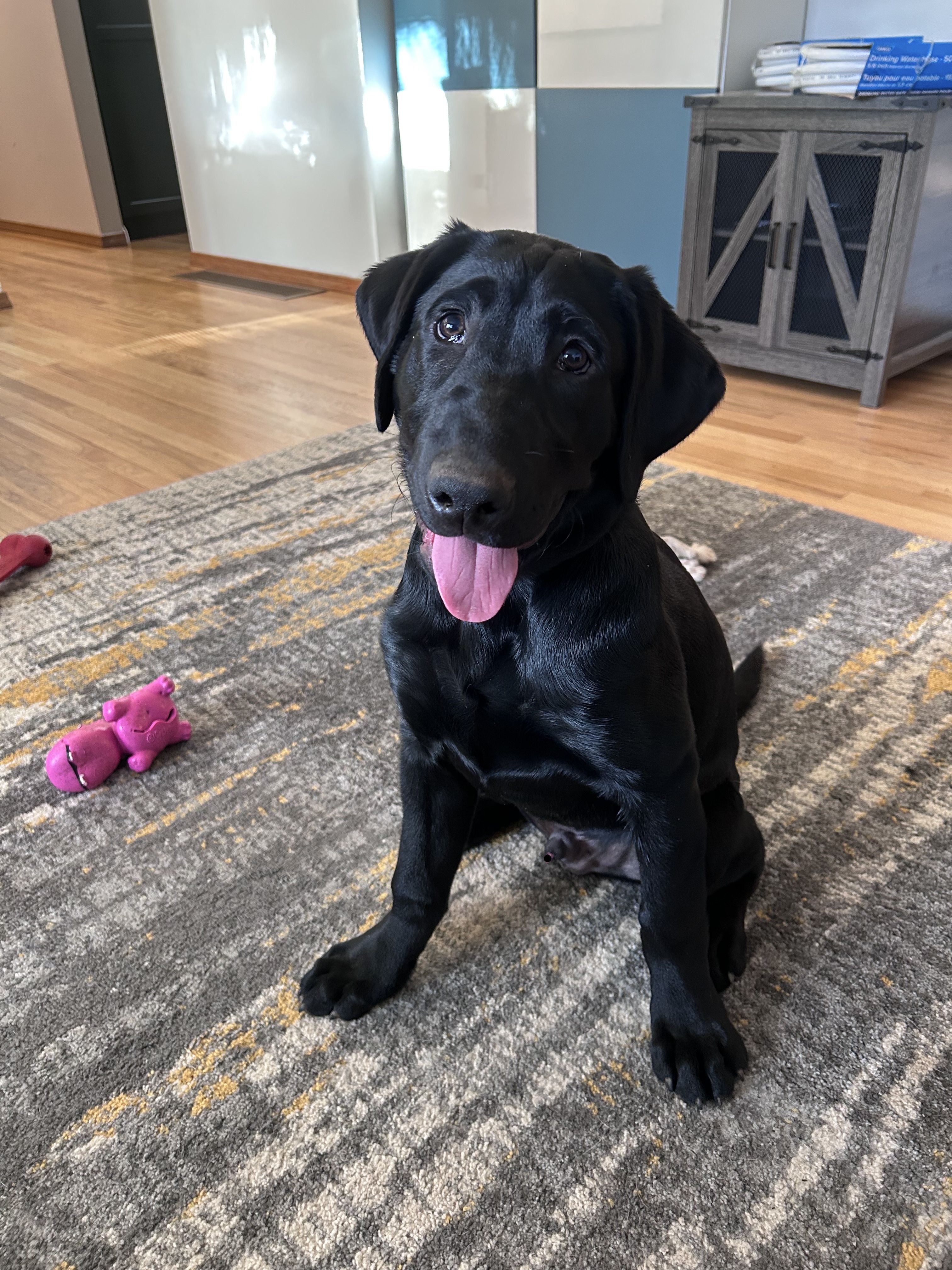 Hi, I’m Moon, and I’m a black Lab. I was born in November of 2025, and brought home to Tigard in January of 2026.